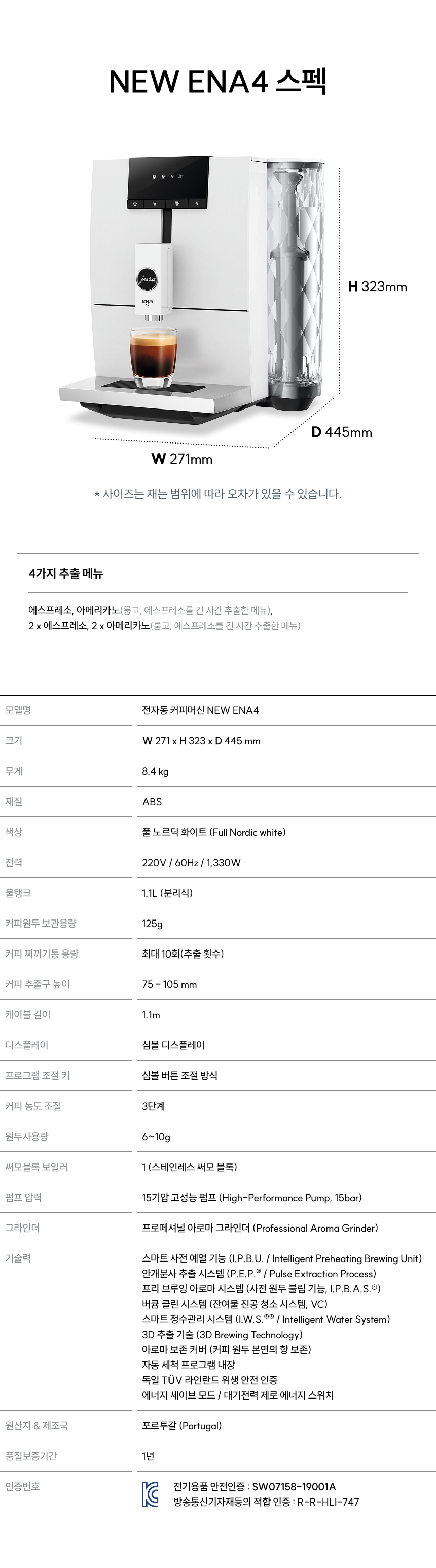 NEW ENA4의 디스플레이 심볼만 적용되지 않았으며, 프로페셔널 아로마 그라인더 탑재 등 기능 업그레이드 부분은 국내에 정식 수입된 NEW ENA4와 동일하오니 구매 시 착오없으시길 바랍니다.